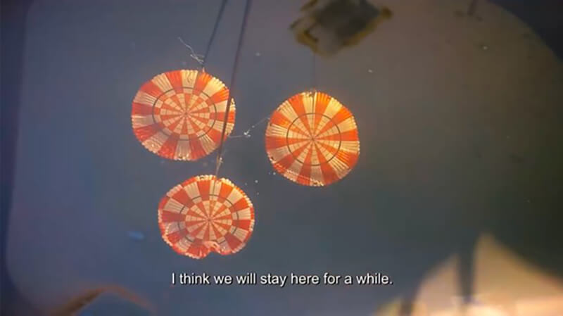 «جایی به نام خانه» با تصویر «انعکاس سه چتر نجات باز در آب» به پایان میرسد. تعداد چترها، نحوهی قرارگیریشان و ترکیببندی کلی تصویر، نامتعارف است و ذهن را مشغول میکند. با کمی جستوجو متوجه میشوم چترهای نجات فضاپیمای اوریون ناسا برای کاهش سرعت کپسول پس از ورود مجدد به جو زمین و تضمین فرود ایمن آن در اقیانوس است. از سویی دیگر فیلم با تصاویر تایملپس آرشیوی از بازگشت فضاپیما به زمین آغاز میشود. پدر روی تصویر به انگلیسی میگوید: «من و دخترها سفر را از ایران شروع کردیم، بعد رفتیم ولز، هلند و سوئد. کسی نمیداند بعد از این کجا خواهیم رفت.»