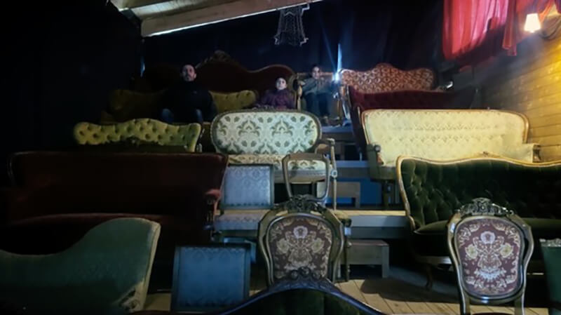 اما اگر قرار باشد برای نامکانیِ خانهی فیلم مثال بزنیم به سکانس کمنظیری میرسیم: پدر به بچهها پیشنهاد میدهد که به سینما بروند چون حوصلهی همه سر رفته است. سالن سینمایی که با صندلی مبل به صورت طبقاتی پر شده است که شبیه به هیچجا نیست و صرفا یک قرارداد است. در نهایت هیچکس فیلم نمیبیند و در یک رفت و آمد سریع و جابهجایی مداوم بازی تمام میشود.